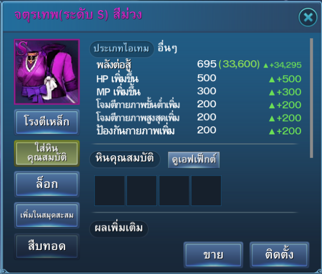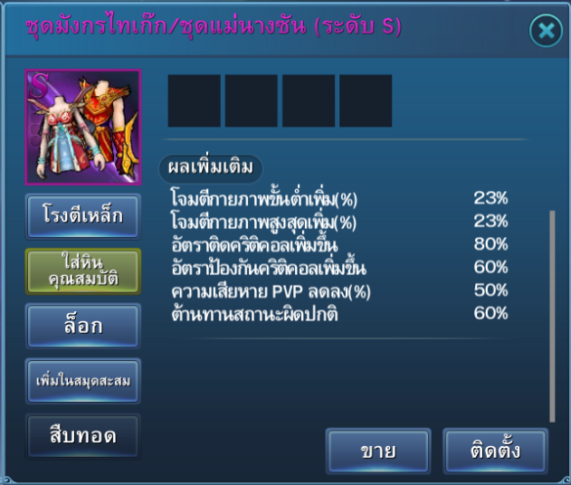 | ชุดนักรบเกราะดำ (ระดับ S) (1 ชิ้น) คุณสมบัติเพิ่มเติม – ความเสียหายPVPเพิ่มขึ้น +20% – ความเสียหายPVPลดลง +20% – HP สูงสุด +10%